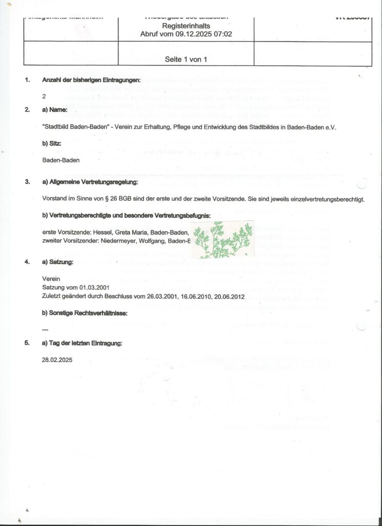 Der Verein Stadtbild Baden-Baden e.V. ist im Vereinsregister Mannheim unter VR 200 637 eingetragen.